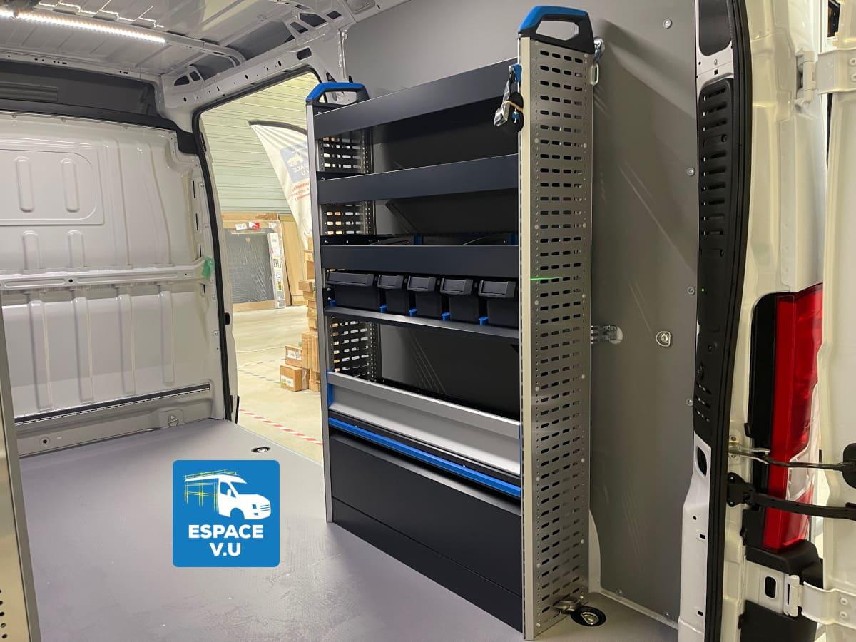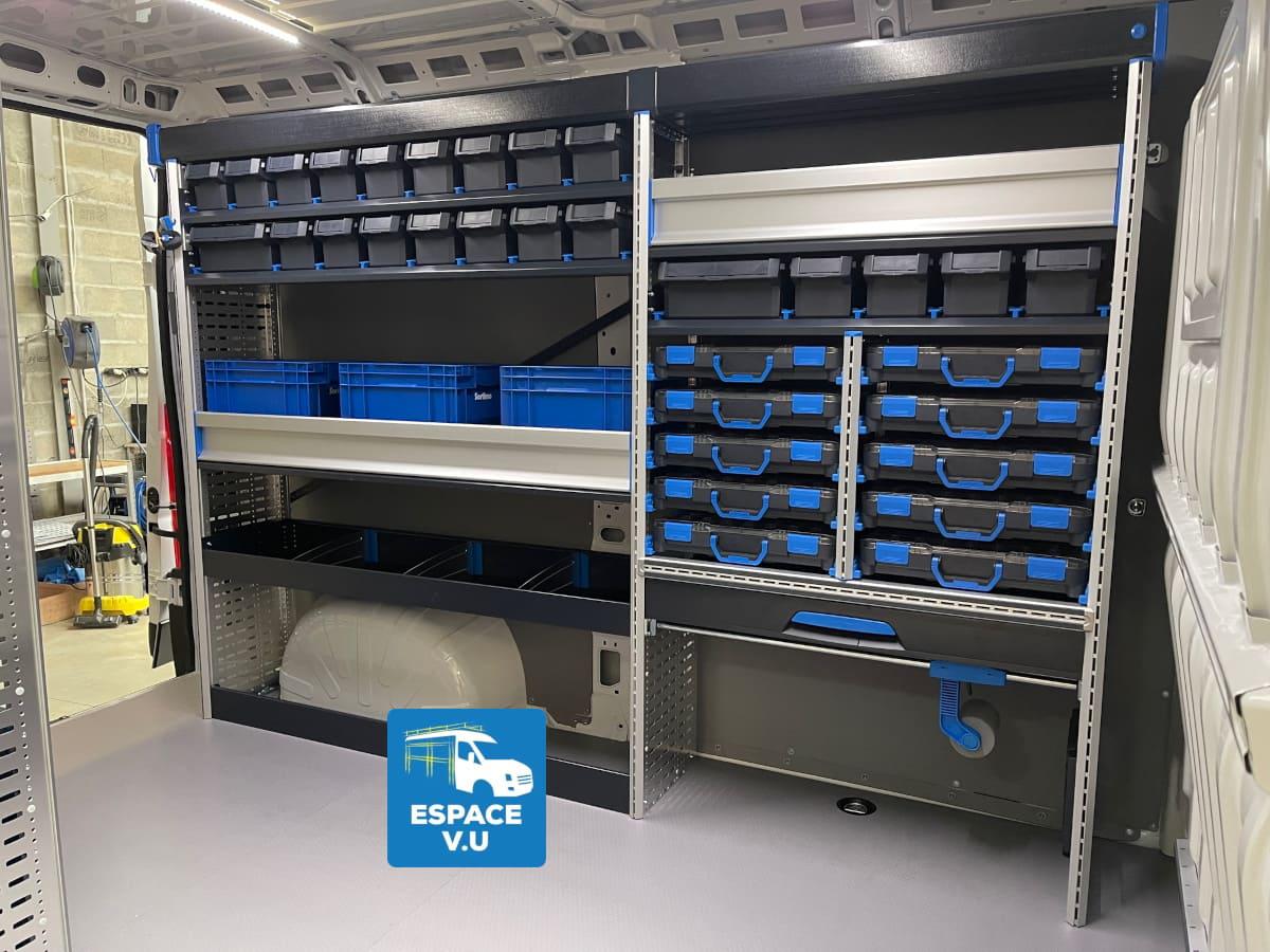 Aménagement intérieur et agencement de rangement modulaire métallique sur mesure, équipement extérieur de fourgon et fourgonnette en